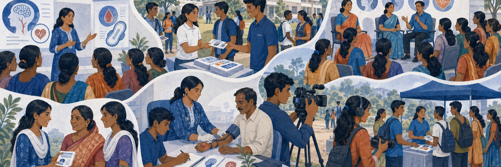 Illustration of Indian students, volunteers, and health educators at IFI Foundation activities